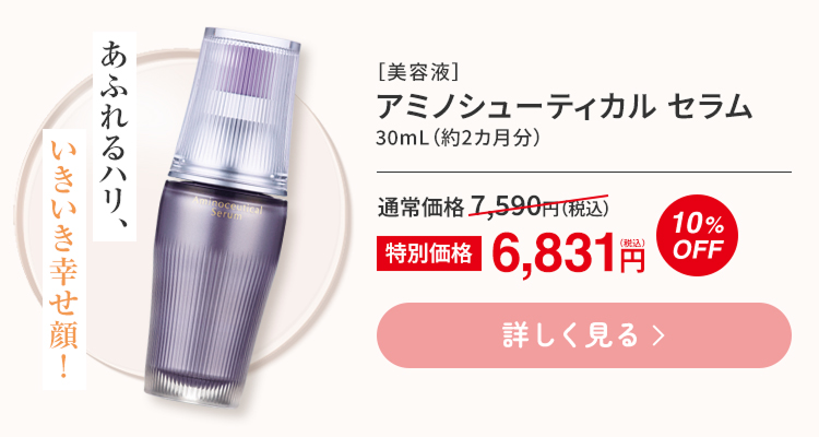 味の素社の皮膚科学研究に基づいた「アミノ美肌理論」により開発。肌のもととなる「アミノ酸」で肌の土台を整えながら、シミやシワなどの肌悩みをケアします。