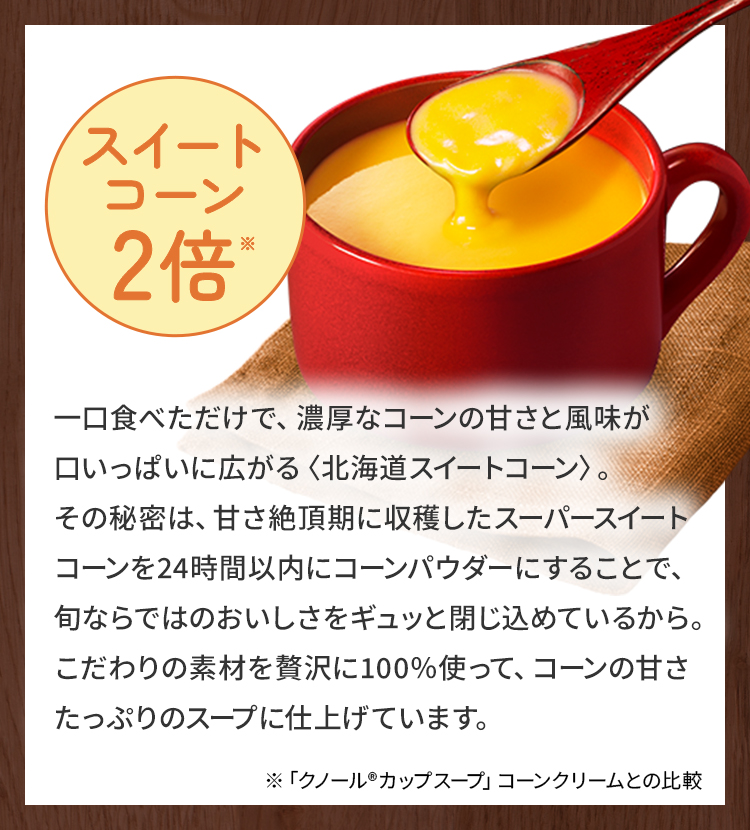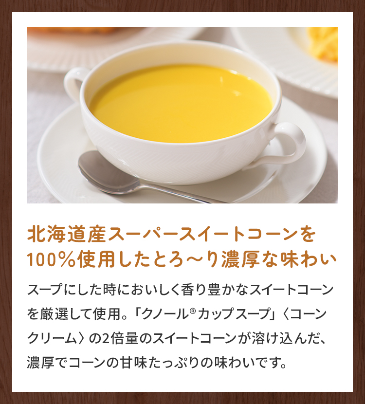 ・原材料名スイートコーン(日本)、全粉乳、デキストリン、でん粉、食用加工油脂、食塩、砂糖、チキンエキス、コーンバターパウダー、バターソテーオニオンパウダー、クリーミングパウダー、たまねぎ、野菜エキス調味料、香辛料、ミルポアパウダー(たまねぎ、にんじん、セロリ、植物油脂、でん粉、ねぎ、バター)、マッシュポテト/調味料(アミノ酸)、乳化剤、増粘剤(グァーガム)