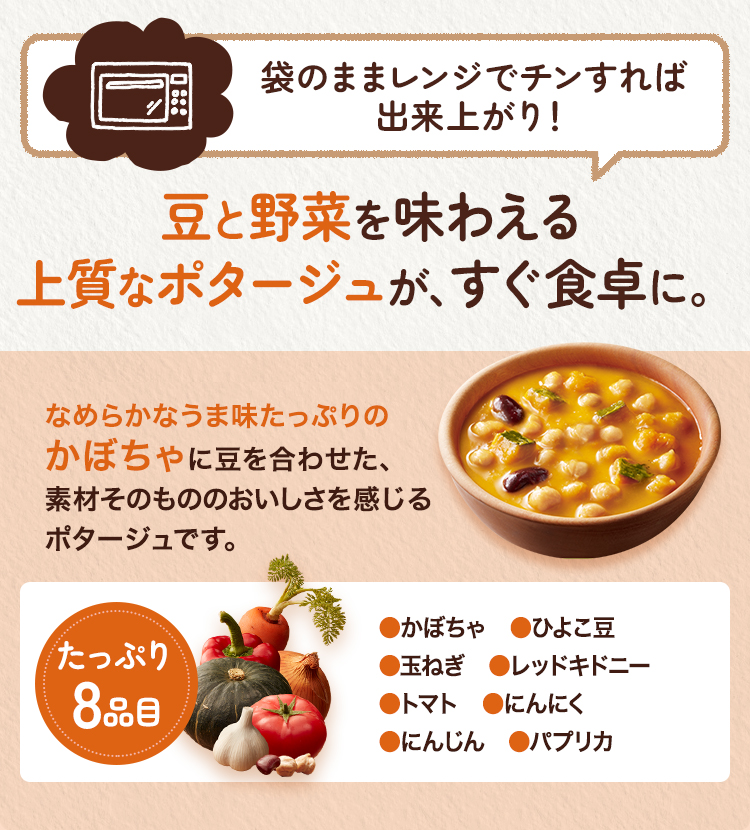 ・原材料名かぼちゃピューレ(アメリカ製造)、ひよこ豆、かぼちゃ、バターソテーオニオン、赤いんげん豆、チキンブイヨン、でん粉、砂糖、オニオンパウダー、トマトペースト、食塩、にんにくペースト、にんじんエキス、パプリカ粉末、デキストリン、香辛料、酵母エキス発酵調味料、たん白加水分解物、酵母エキス/糊料(加工デンプン)、調味料(アミノ酸等)