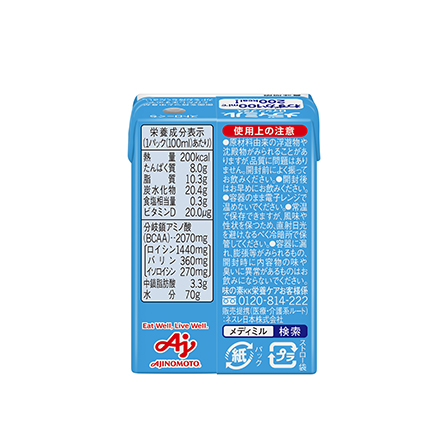 筋肉をつくる成分であるたんぱく質は、アミノ酸でできています。「メディミル」ロイシン プラスでは、たんぱく質8gを、アミノ酸の中でも特に重要な働きをする注目成分“ロイシン”を強化して配合しています。