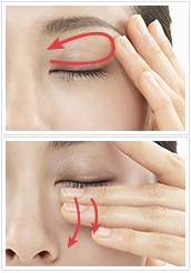 メイクがなじんだら、指の腹を目のきわにあてて、アイライン、マスカラになじませます。準備しておいたコットンを1枚取り、片目ずつ上から下へふき取ります。片目につきコットン1枚をご使用ください。
