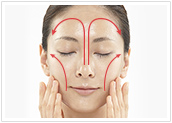 『アミノクレンジングジェル』をさらに1プッシュ手に取り、顔全体のメイクになじませます。うぶ毛に逆らうように矢印の方向(下から上)になじませながら、汚れを浮き上がらせます。最後に水かぬるま湯でやさしく洗い流しましょう。