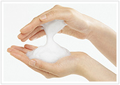 『アミノ モイスト クリアソープ』を、水かぬるま湯を加えて手のひらで5~6回やさしく転がします。ホイップクリームをつくるように空気を含ませながら徐々に泡立てます。