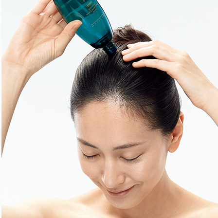 容器の先端を頭皮に軽くつけるようにして、少量ずつつけて指の腹でなじませます。