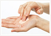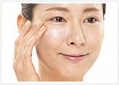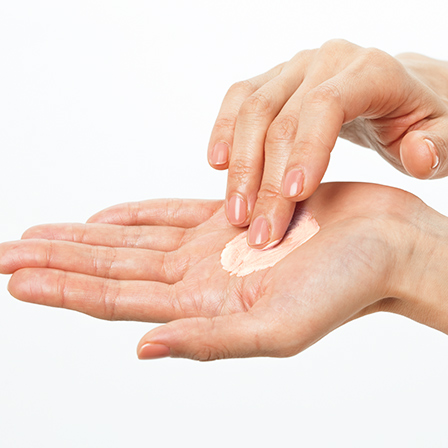 適量(パール粒大)を手のひらにとり、中指と薬指で空気を含ませるようにクルクルとなじませながら温めます。(このひと手間で、肌になじみやすくなり、塗りムラが少なくなります。)