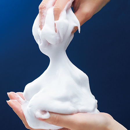 『アミノ ホワイト ソープ』を、水かぬるま湯を加えて手のひらで5~6回やさしく転がします。ホイップクリームをつくるように空気を含ませながら徐々に泡立てます。