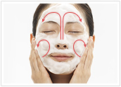 泡のクッションを肌の上で転がすようなイメージで顔全体を包みます。できるだけ手が肌に直接ふれないように心がけ、うぶ毛を起こすように、下から上に向かってやさしく洗います。