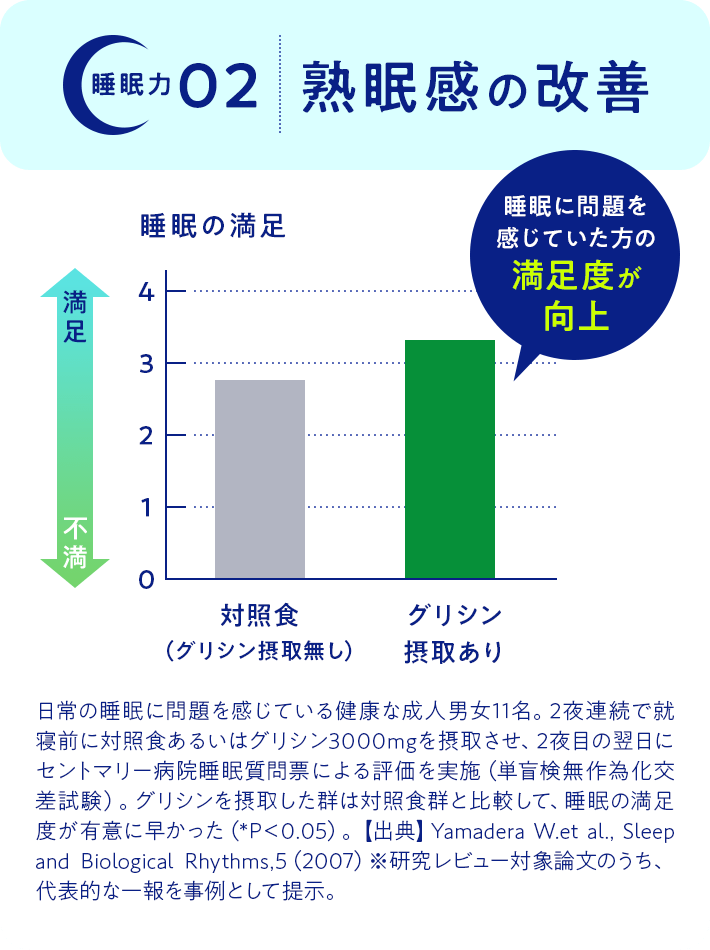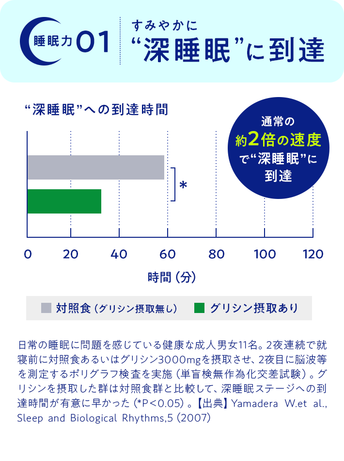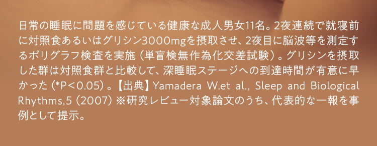 本品には“グリシン”が含まれており、すみやかに深睡眠をもたらし、睡眠の質の向上(熟眠感の改善、睡眠リズムの改善)や、起床時の爽快感のあるよい目覚め、日中の眠気の改善、疲労感の軽減、作業効率の向上に役立つ機能があります。