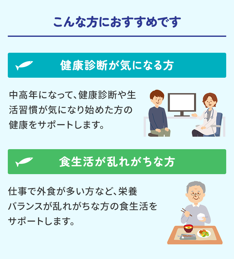 仕事で外食が多い方など、栄養バランスが乱れがちな方の食生活をサポートします。