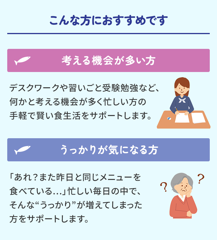 デスクワークや習いごと受験勉強など、何かと考える機会が多く忙しい方の手軽で賢い食生活をサポートします。