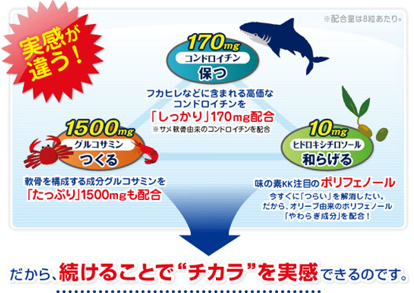 還元麦芽糖水飴(国内製造)、サメ軟骨抽出物(コンドロイチン含有)、オリーブ葉抽出物(ヒドロキシチロソール含有)、デキストリン、でん粉/グルコサミン(えび・かに由来)、セルロース、環状オリゴ糖、ステアリン酸カルシウム、酸化ケイ素、シェラック