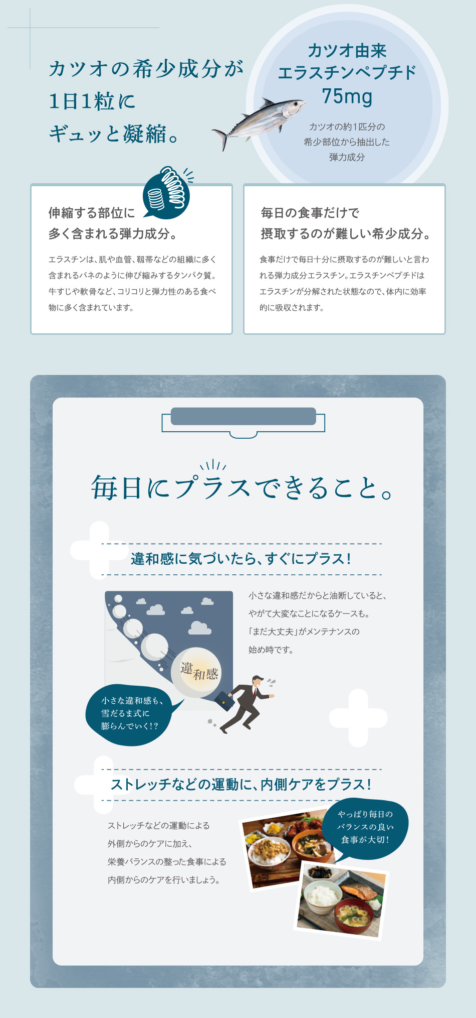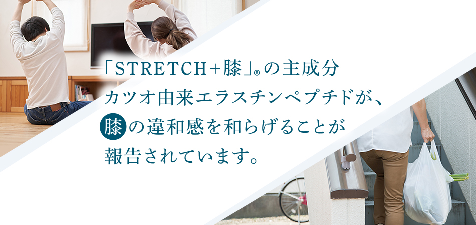 本品にはカツオ由来エラスチンペプチドが含まれています。カツオ由来エラスチンペプチドには、ひざ関節に違和感を持つ健康な中高年のひざ関節の動きをサポートし、違和感を和らげる機能があることが報告されています。