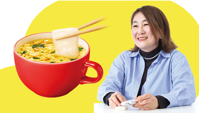 河東:私自身、受験勉強中に、母が差し入れてくれた残り物の味噌汁に励まされた思い出があります。味の素の工場は、大きなお台所。実際に食材を大きな釜に入れて作るんですが、たまご、しいたけ、ワカメの3種の具入りスープともちの組み合わせに、おうちで出てくる味を感じてもらえたらなと。
